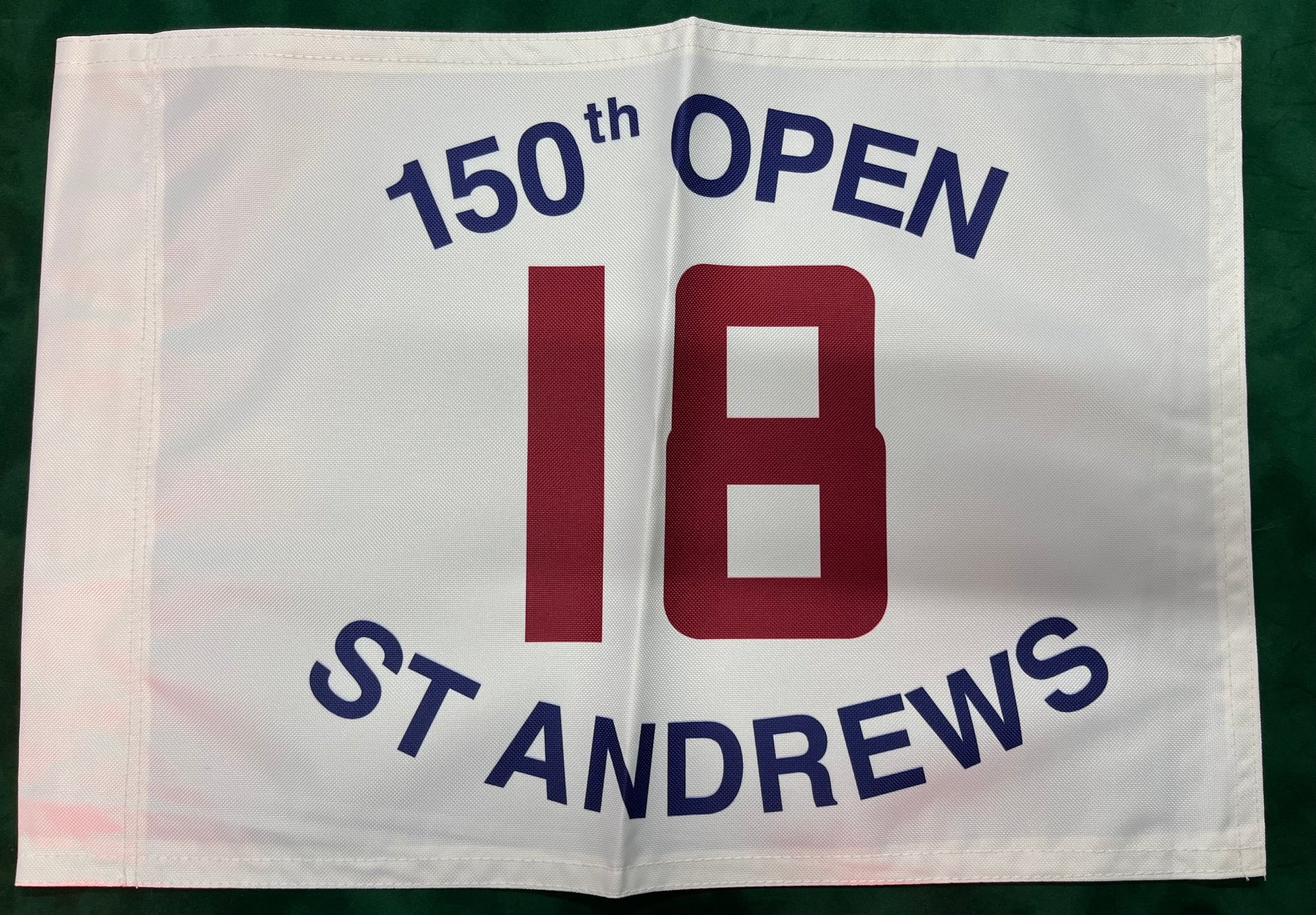 Take a swing at this unique collectible: a 150th Open Championship at St Andrews Unsigned Golf Flag in white. This flag features the number 18 to represent the 18th hole and is the perfect addition to any golf fan's collection. Tee off your love for golf with this one-of-a-kind item!