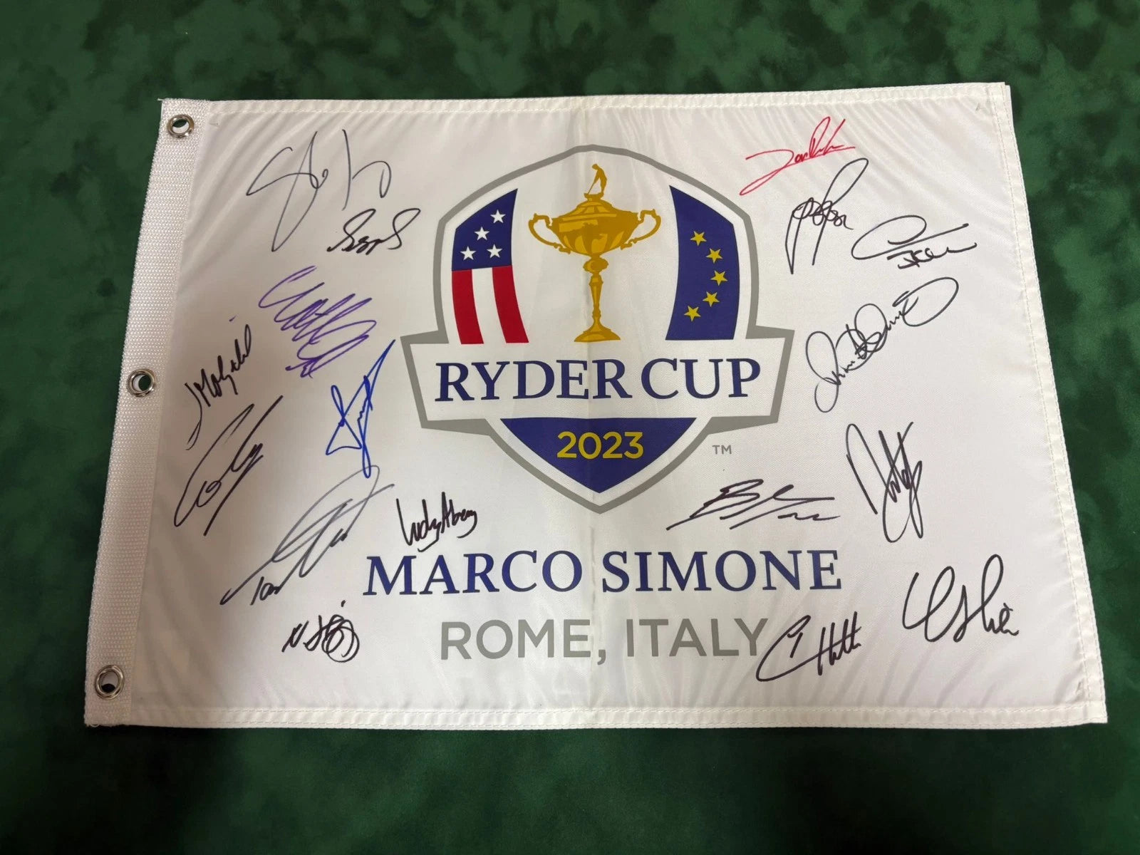 On offer here is the 2023 Ryder Cup Flag signed by 17 team members (players/captain/vices):