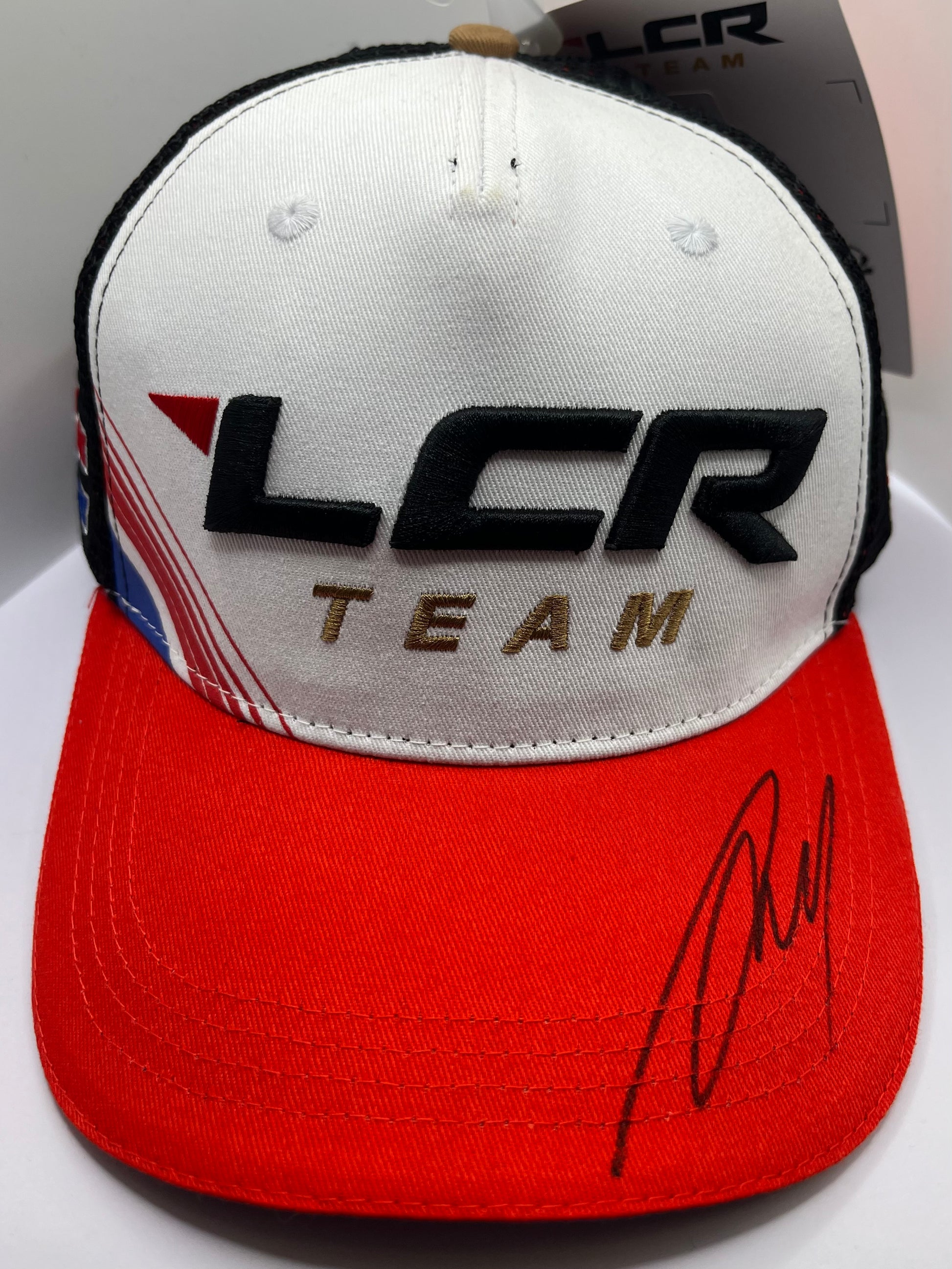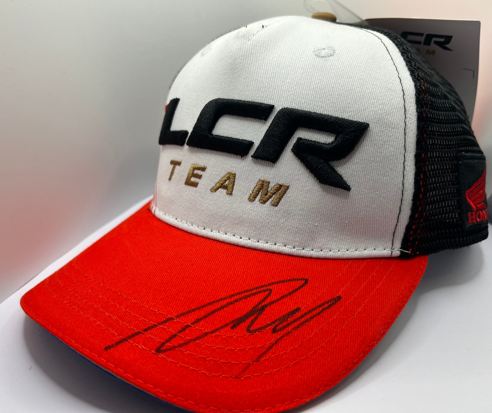 This red and white LCR Honda MotoGP cap has been personally signed by Alex Marquez himself. The cap comes with a certificate of authenticity, ensuring its legitimacy. Show your support for the MotoGP rider and add this unique, signed cap to your collection.
