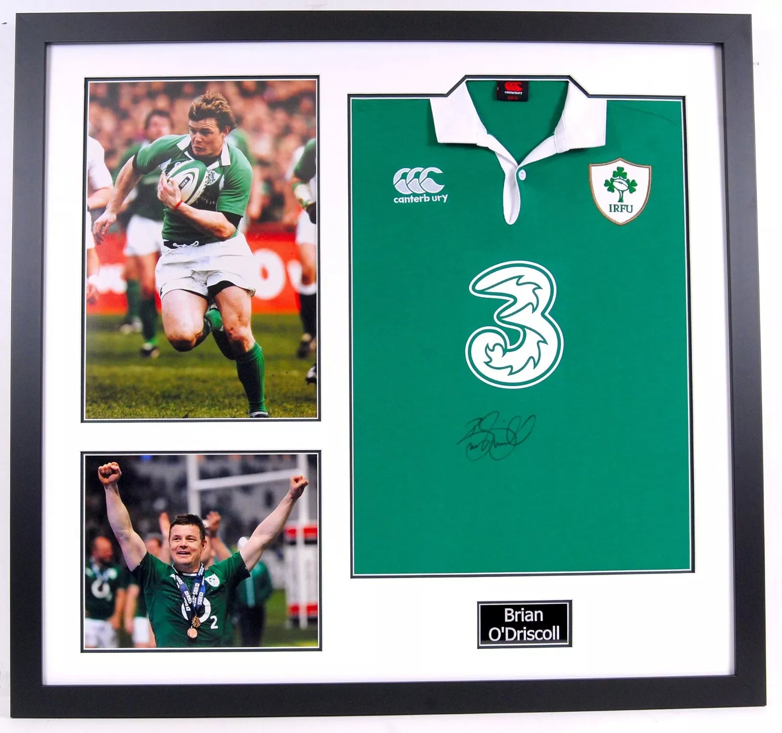 This signed and framed Irish rugby shirt, featuring the legendary Brian O'Driscoll, is a must-have for any sports collector. With a dealer COA included, this piece is guaranteed to be authentic. Show off your love for the sport with this one-of-a-kind item.