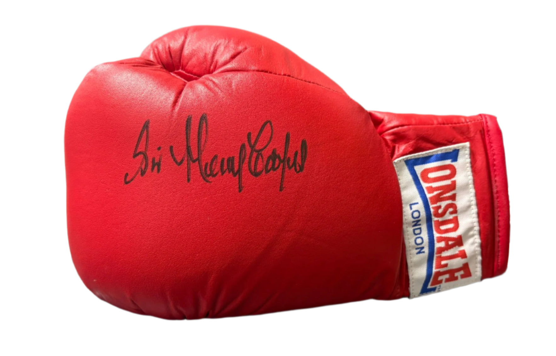 This red Lonsdale boxing glove has been signed by the legendary British boxer, Sir Henry Cooper. As a true icon in the world of boxing, Sir Henry's signature adds value and authenticity to this collector's item. Includes a Certificate of Authenticity.