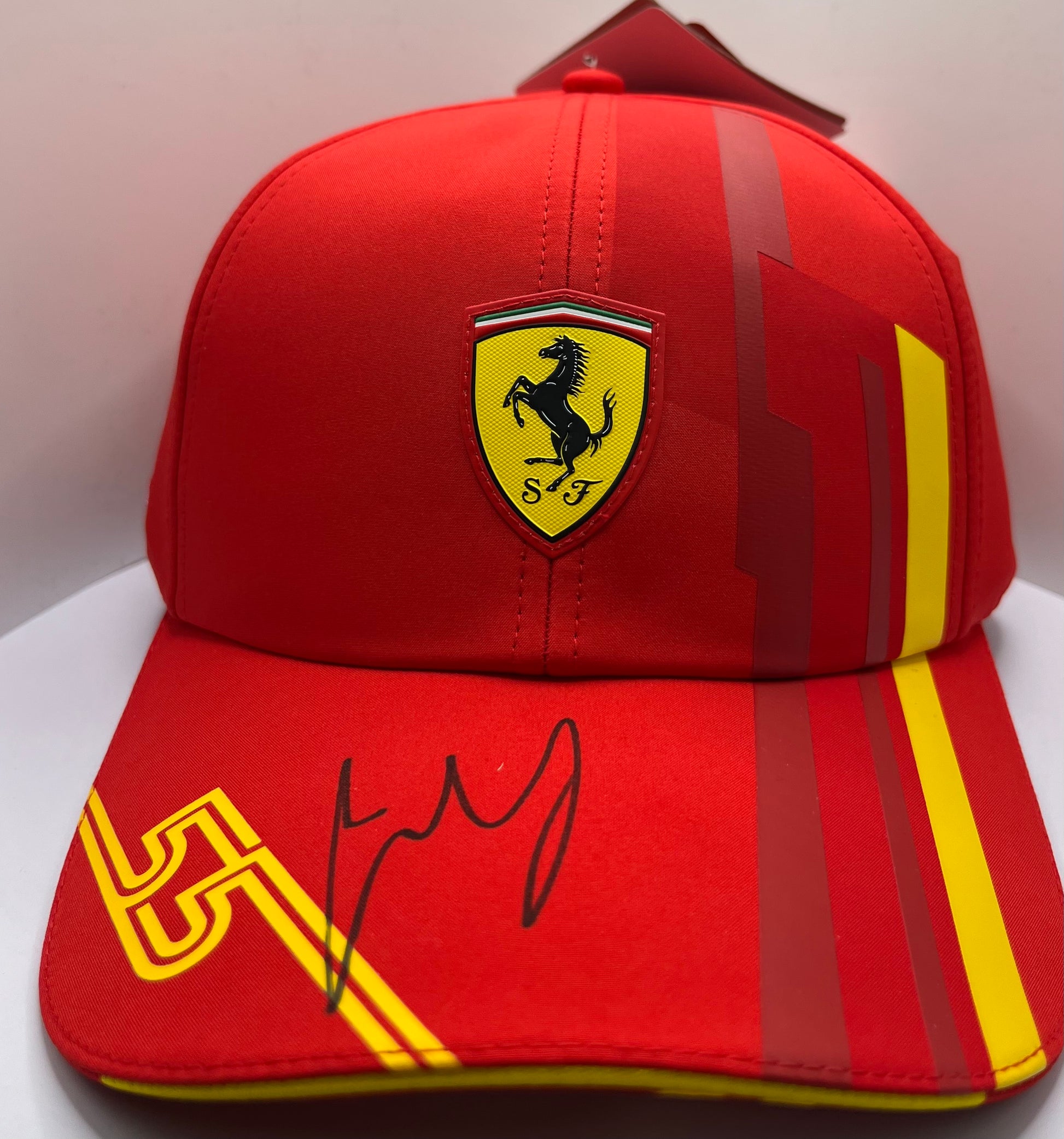 Enhance your F1 collection with this authentic signed Carlos Sainz Ferrari F1 cap. Made from high-quality materials, it features bold red and yellow colours and is sure to impress fellow racing enthusiasts. Includes a certificate of authenticity for added value.