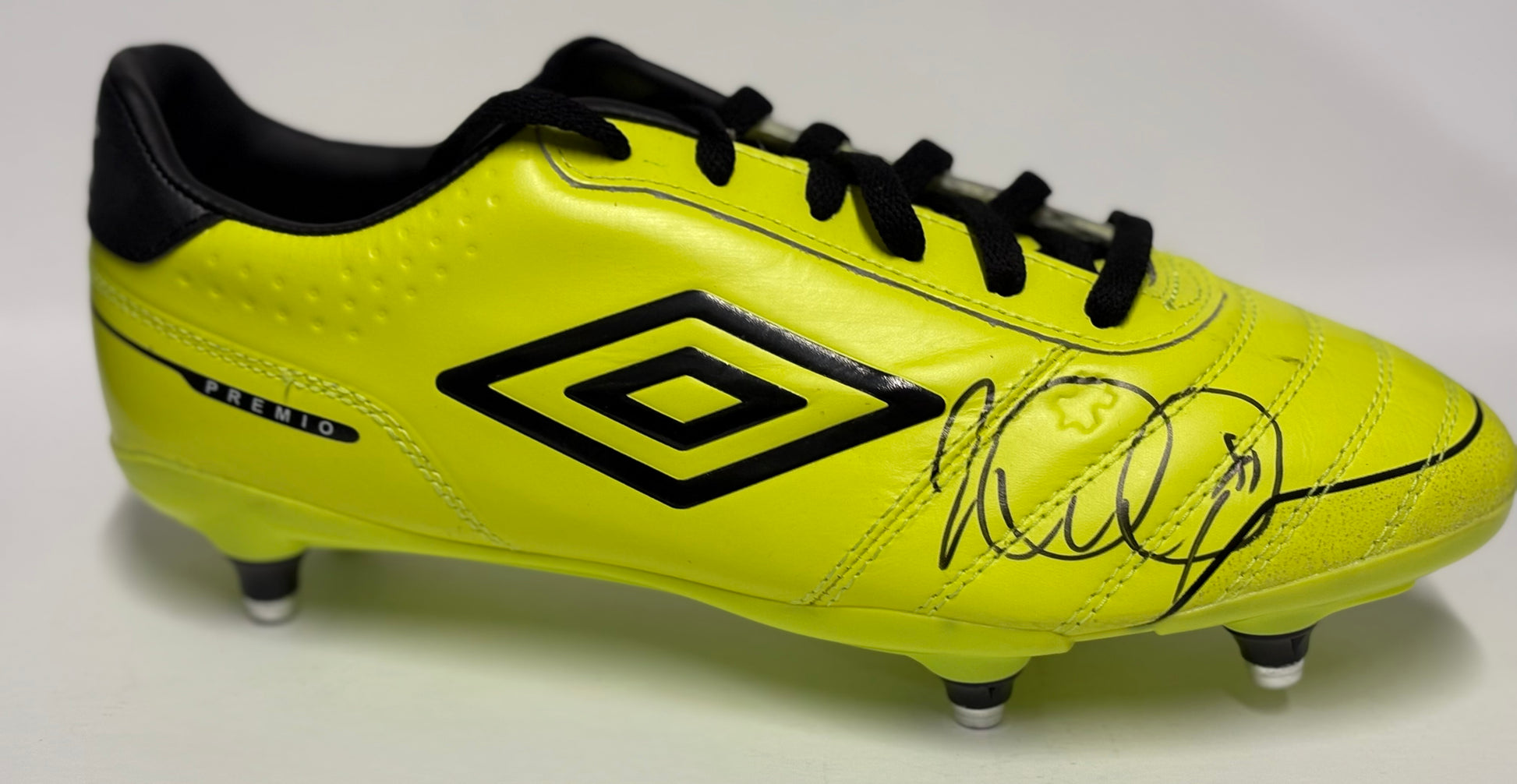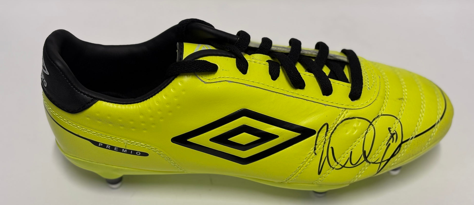 Score a winning goal with this signed yellow Umbro Premio football boot from legendary player Ian Wright. With a certificate of authenticity included, this quirky find is perfect for any sports collector or fan.
