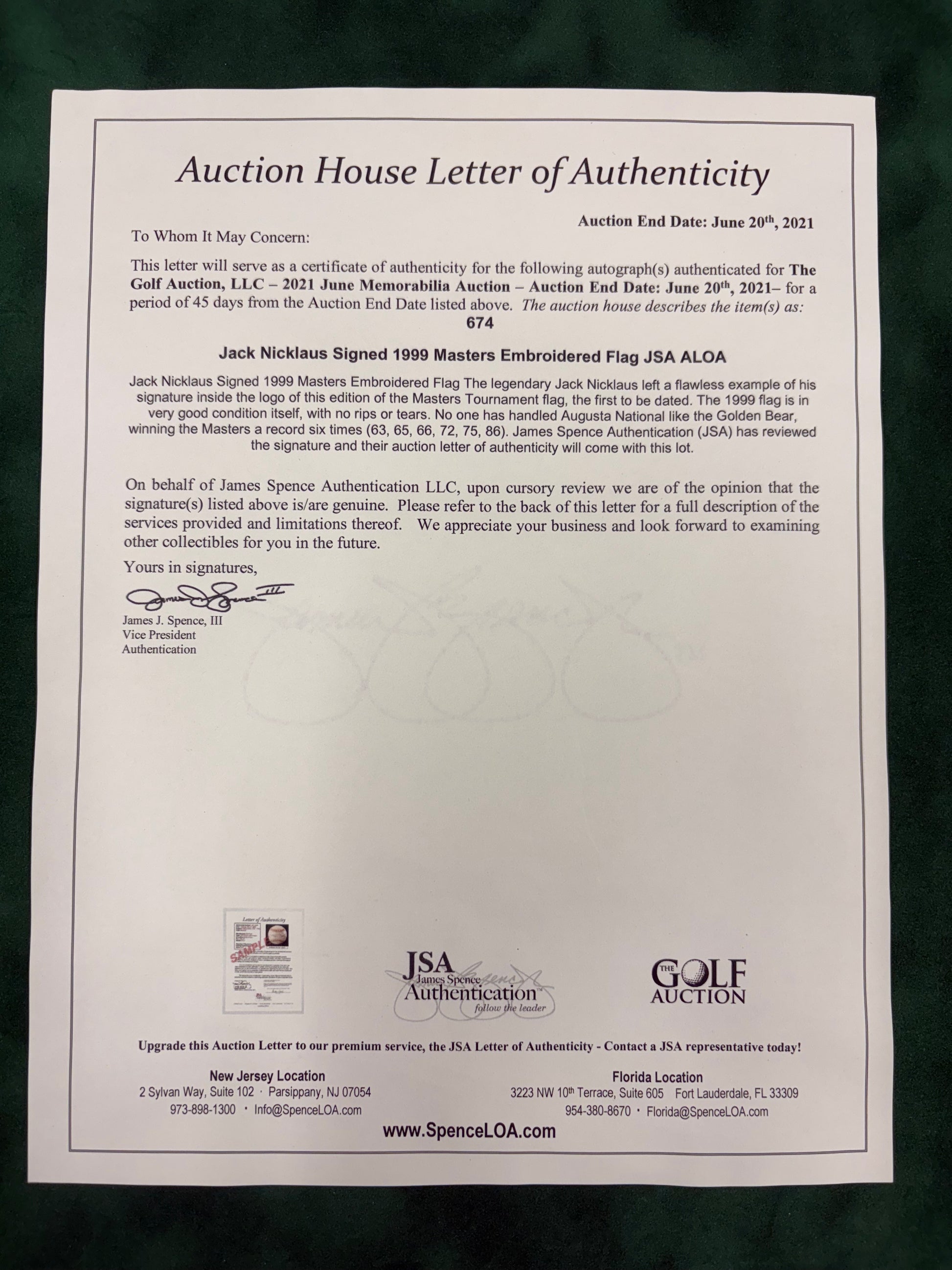 Jack Nicklaus - Golf Legend Signed 1999 Masters Golf Flag + Dealer COA JSA AHLOA