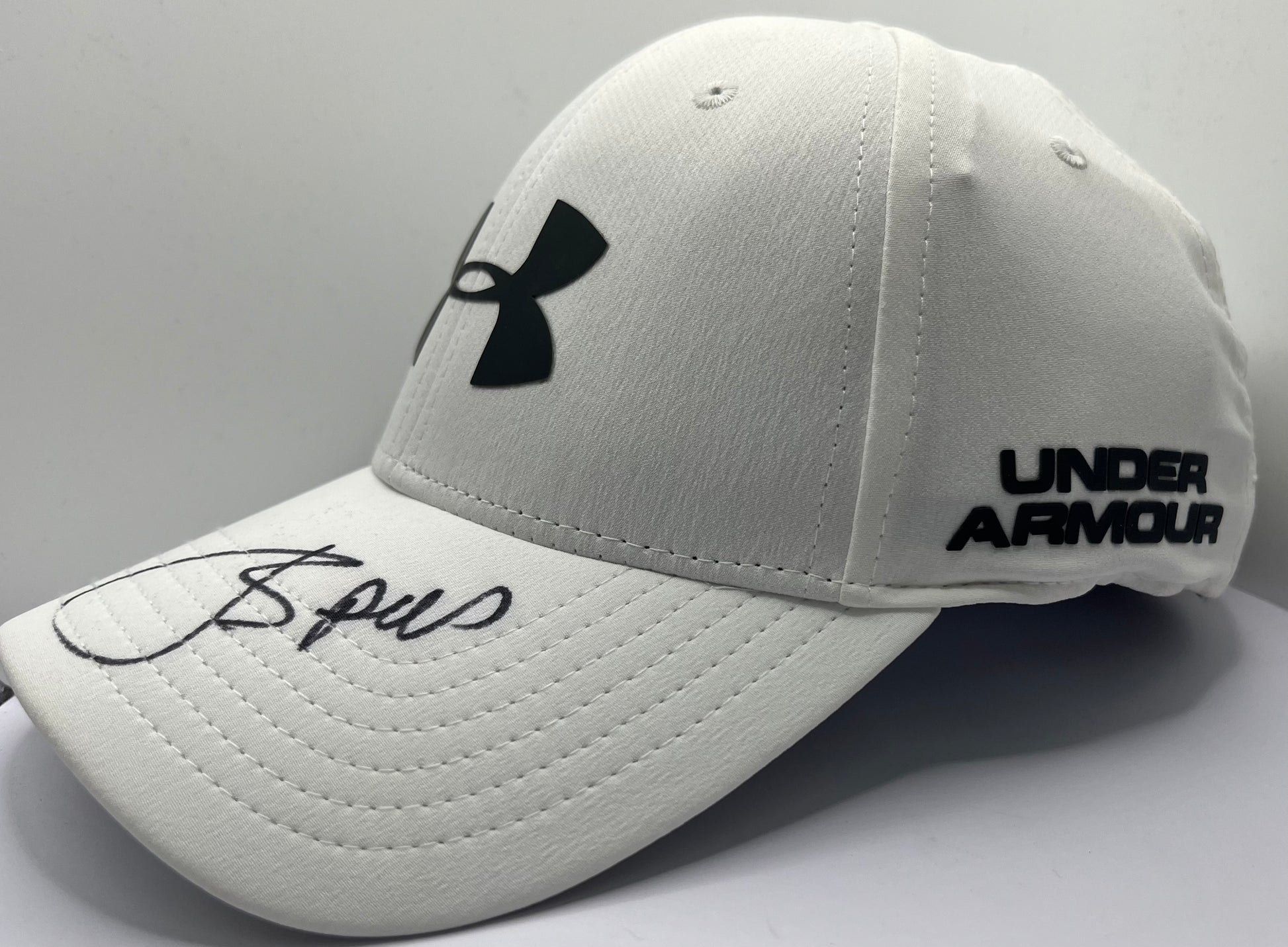 This is a white and black Under Armour golf cap, signed by three-time major winner and the 2015 FedEx Cup champion, Jordan Spieth. This cap comes with a Certificate of Authenticity. Perfect for any golf fan or collector looking to add a piece of golf history to their collection.