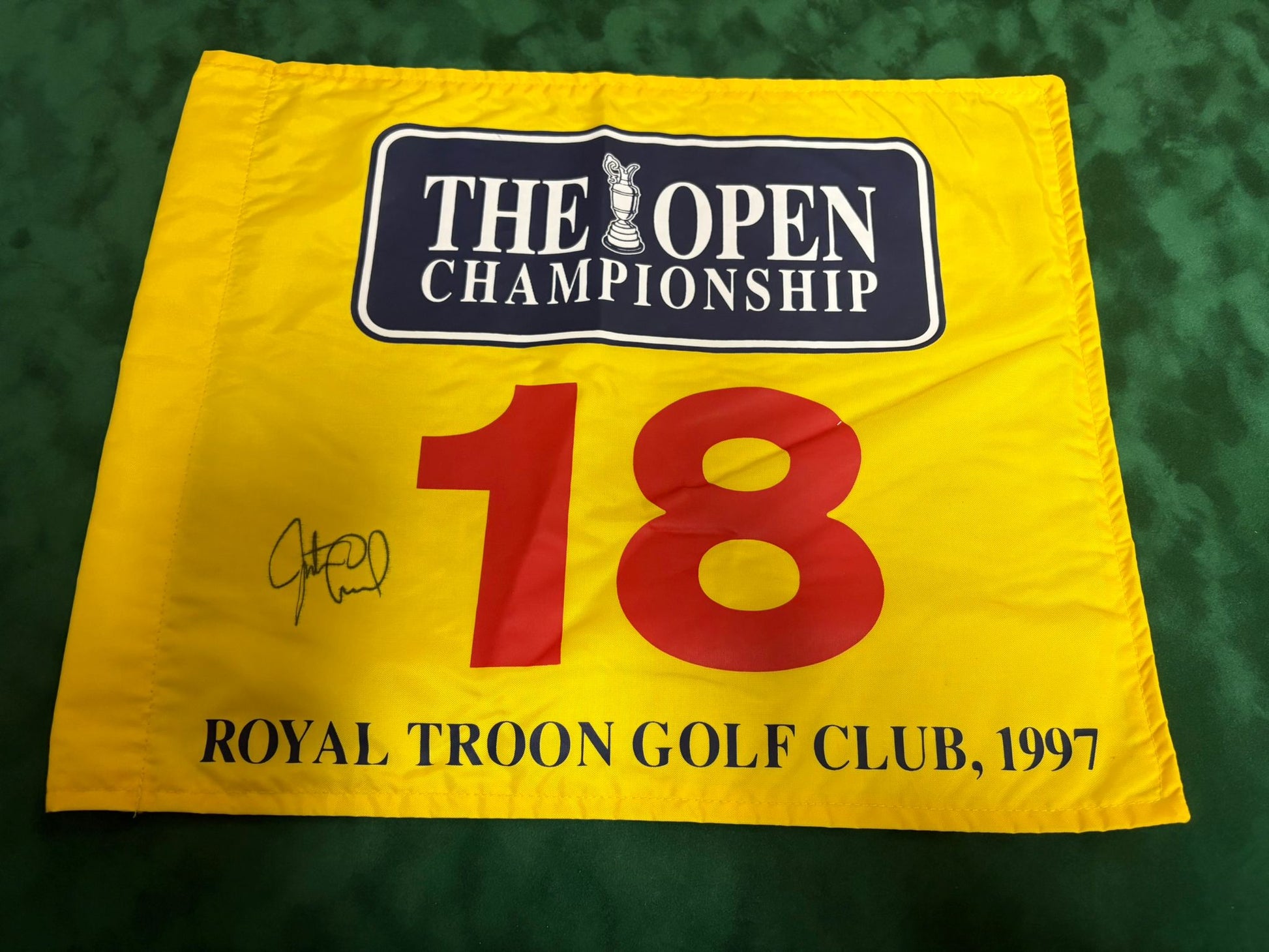 Justin Leonard Winner Signed 1997 Open at Royal Troon Golf Pin Flag + Dealer COA