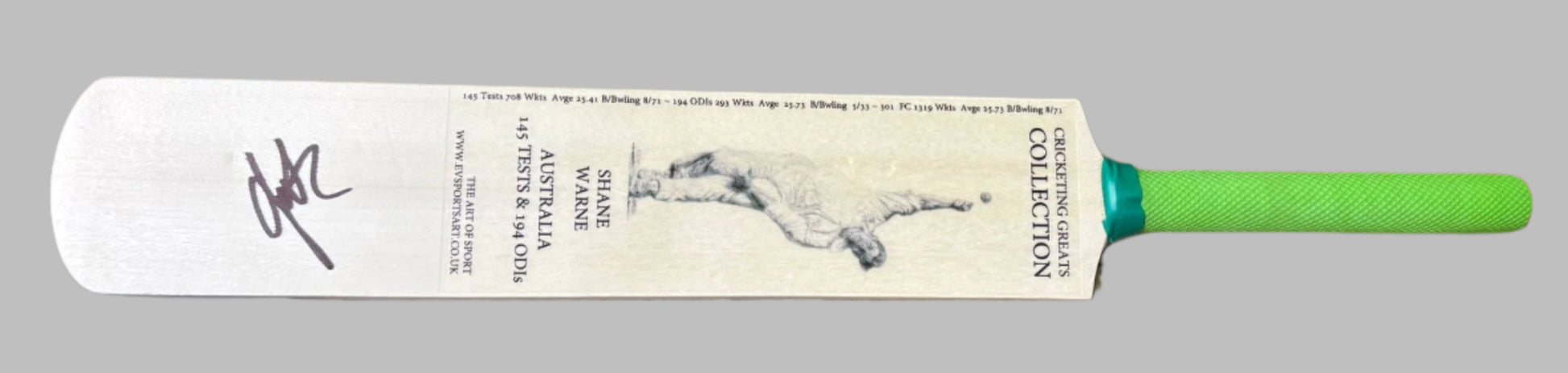 Celebrate cricketing history with this mini cricket bat signed by the legendary Shane Warne. Perfect for fans and collectors alike, it comes with a dealer Certificate of Authenticity to guarantee its genuine signature. A charming keepsake that brings a touch of sporting greatness to your home or office!