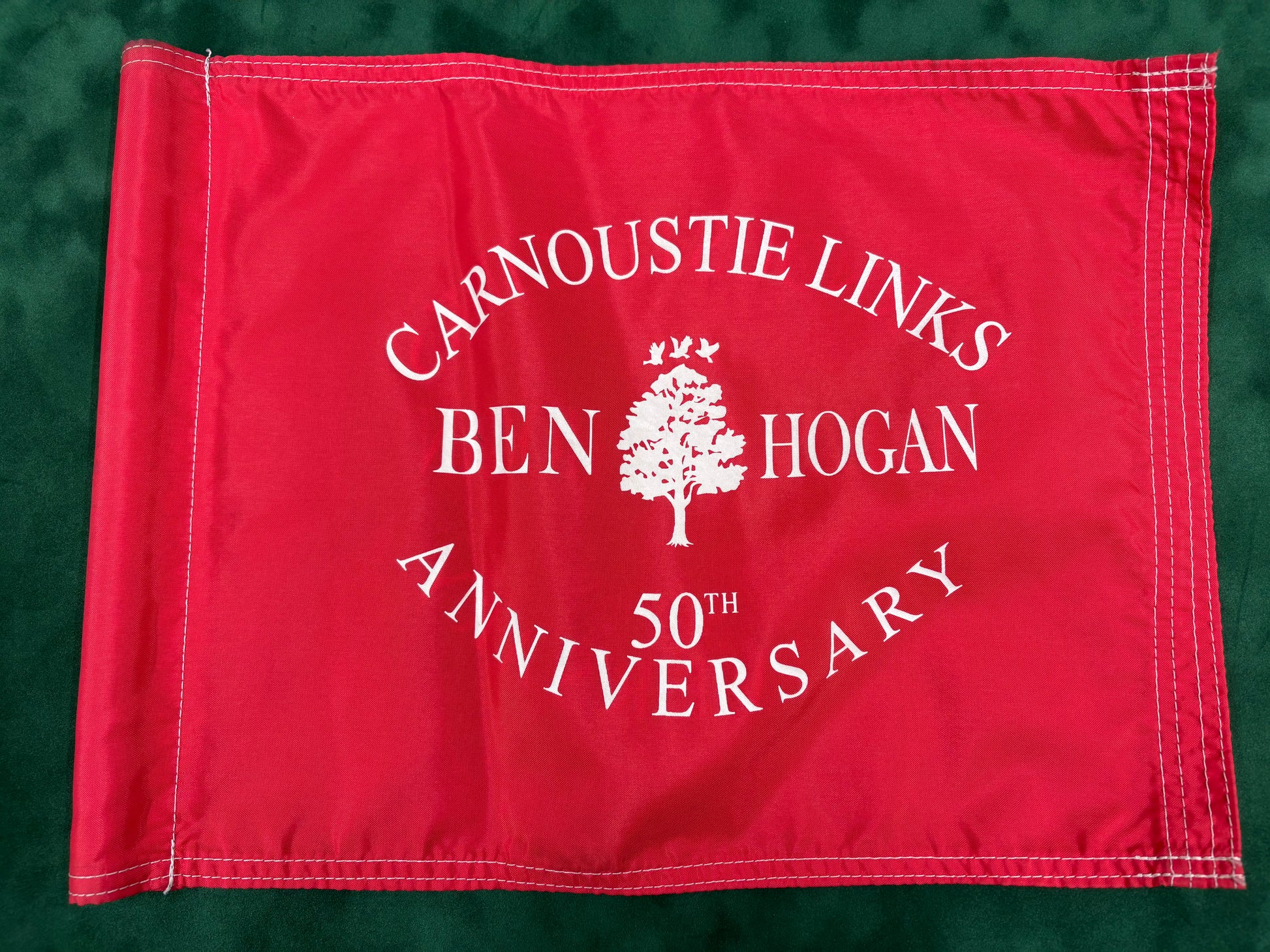 On offer here is a Rare Carnoustie Links Ben Hogan 50th Anniversary Course Used Golf Flag