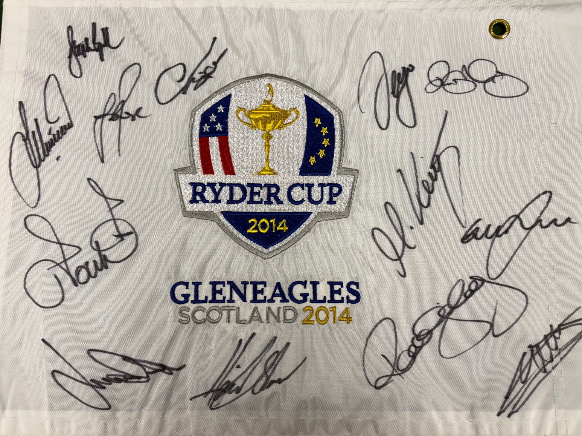 On offer here is a 2014 Ryder Cup at Gleneagles Golf Flag signed by Team EUROPE