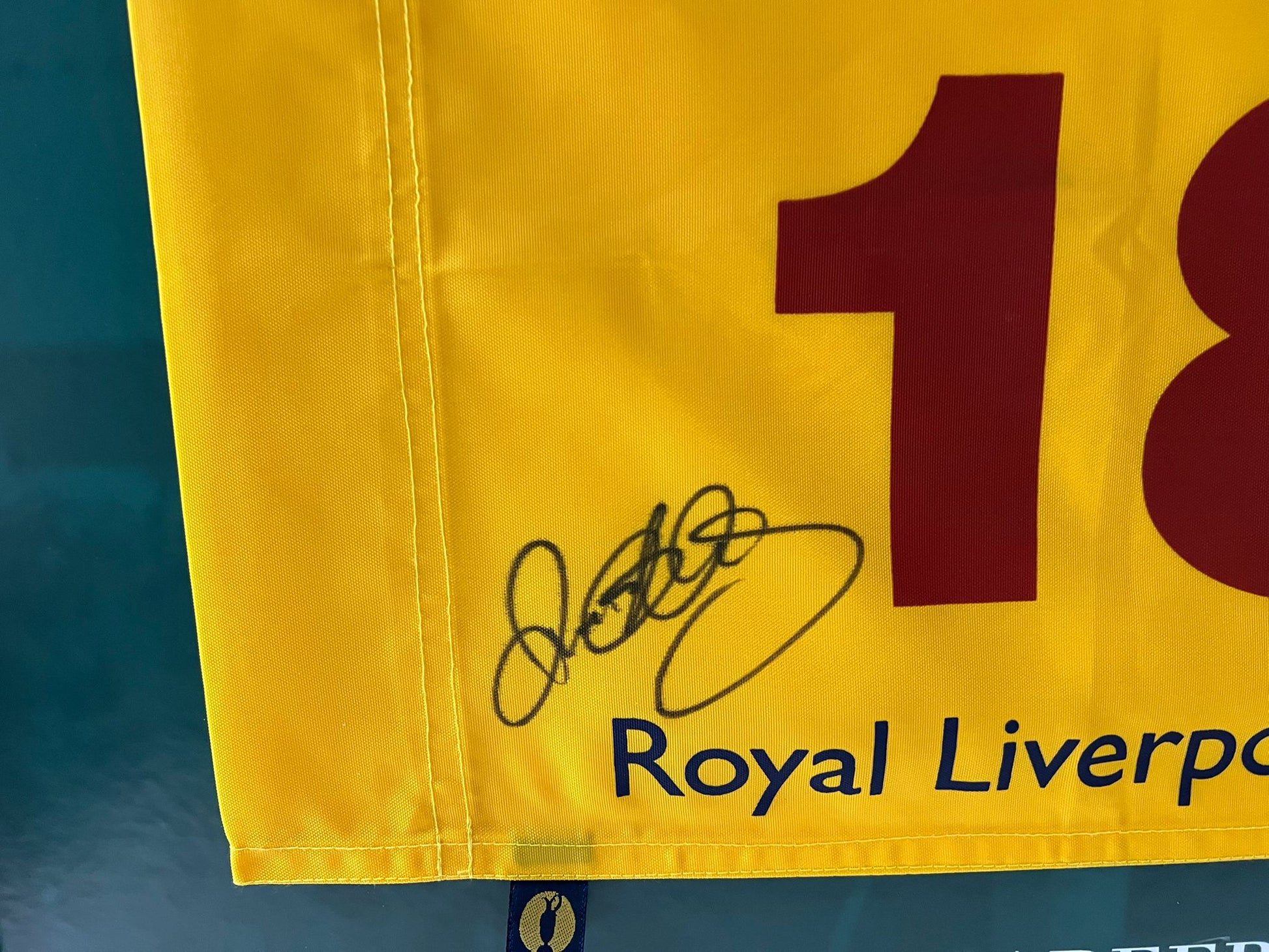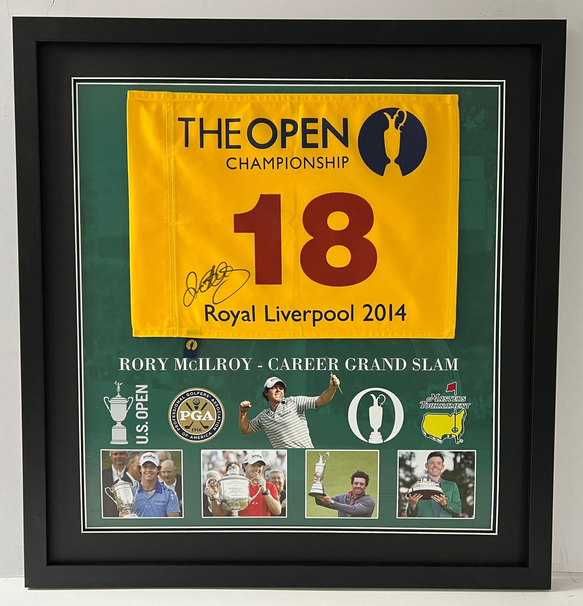 On offer here is a Career Grand Slam Frame including a 2014 Open at Royal Liverpool Golf Flag Signed by Winner Rory McIlroy