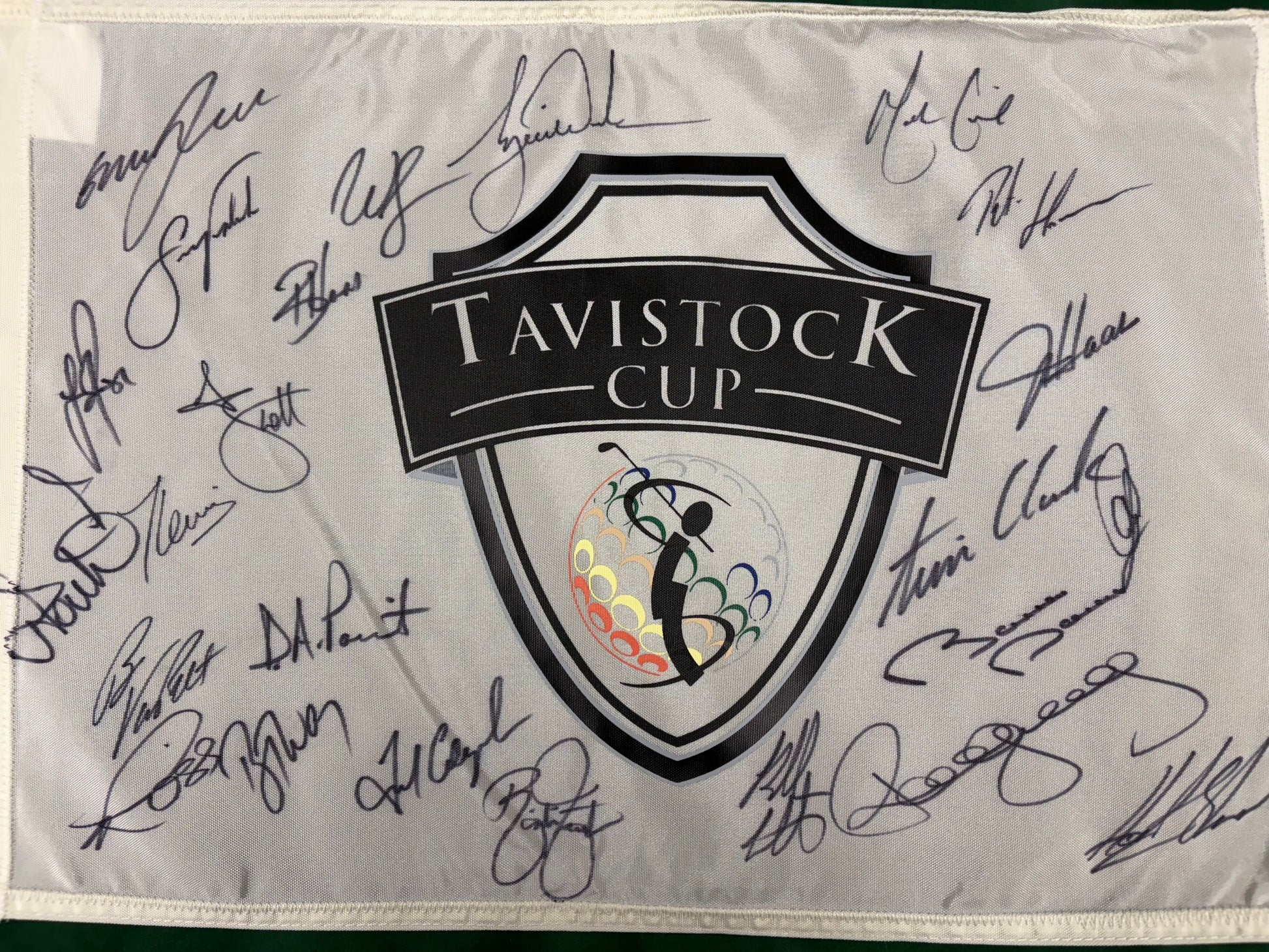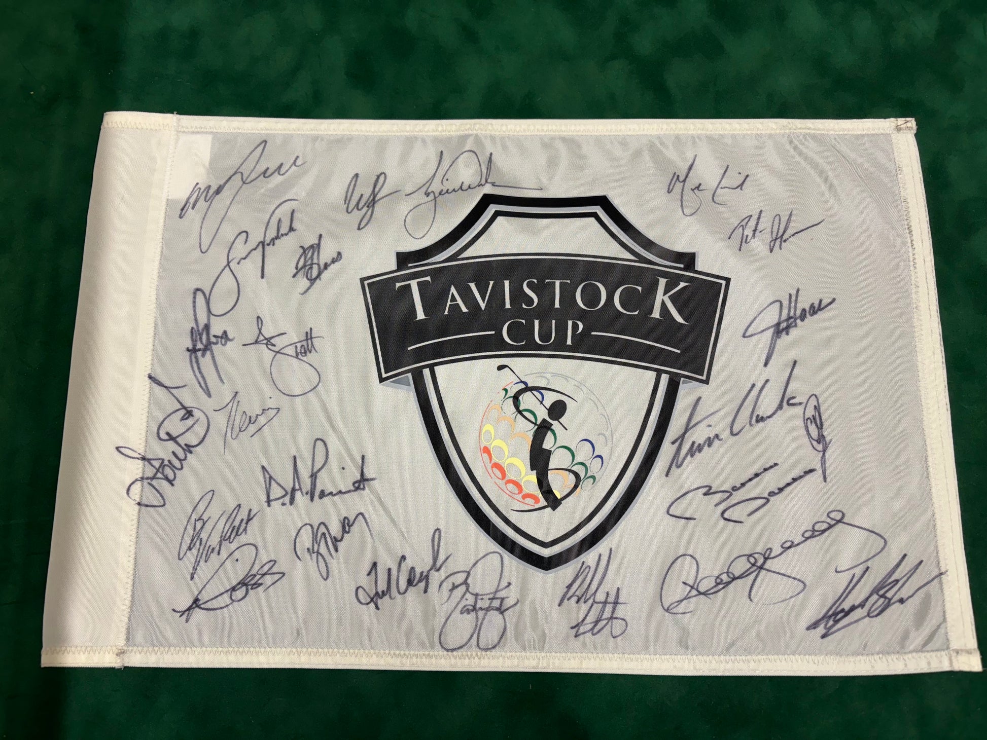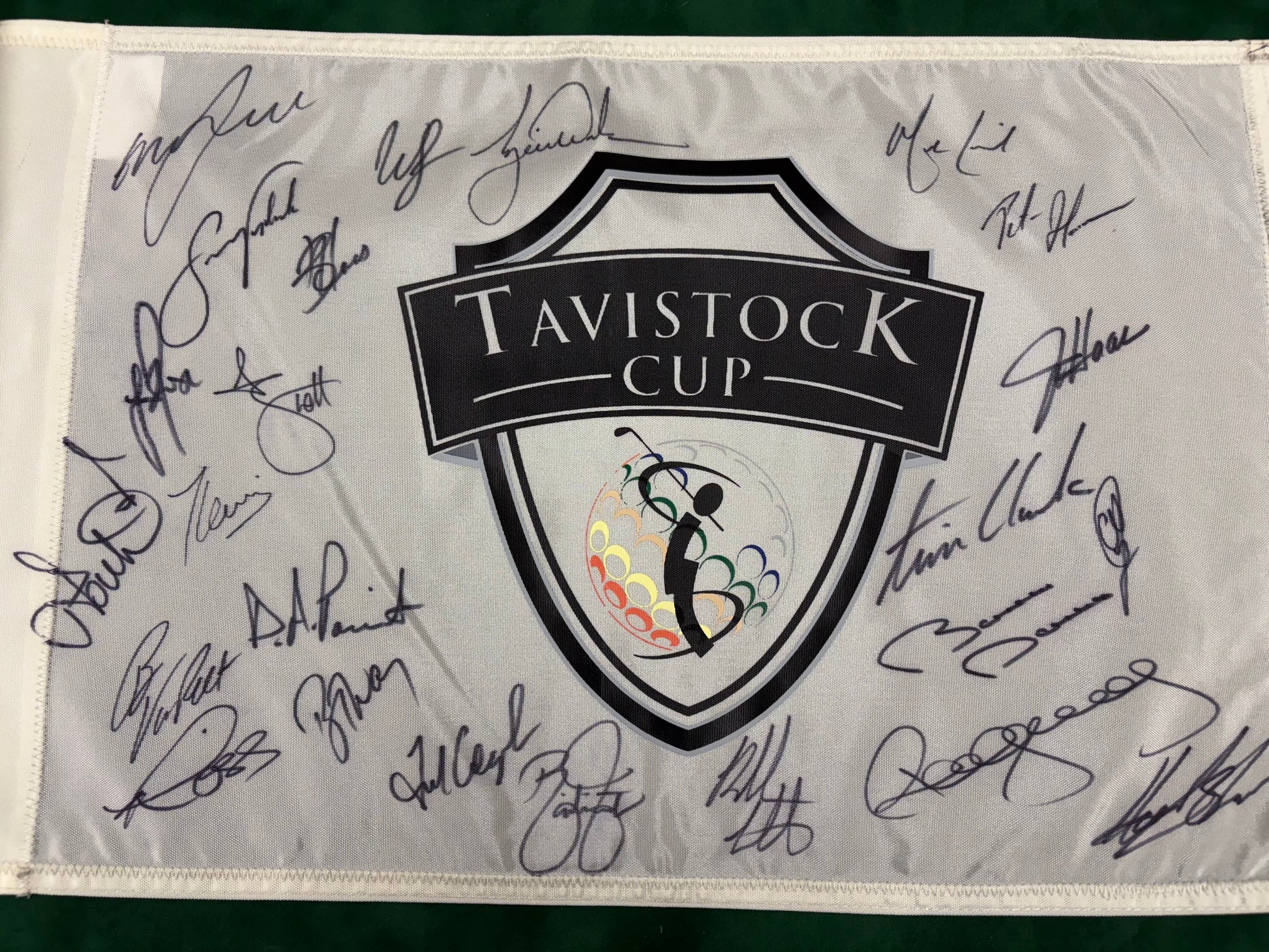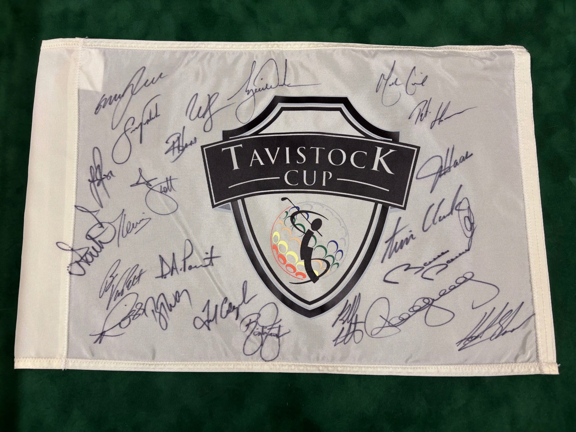 On offer here is a Tavistock Cup Golf Flag Signed by 24 Players: