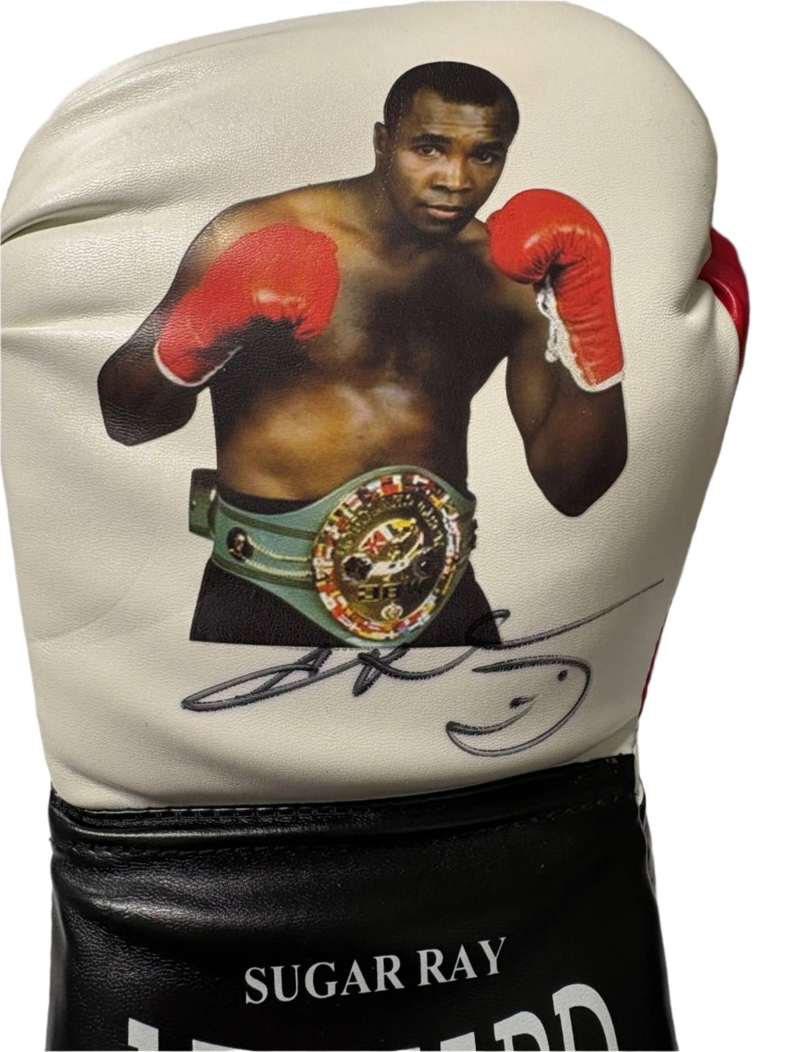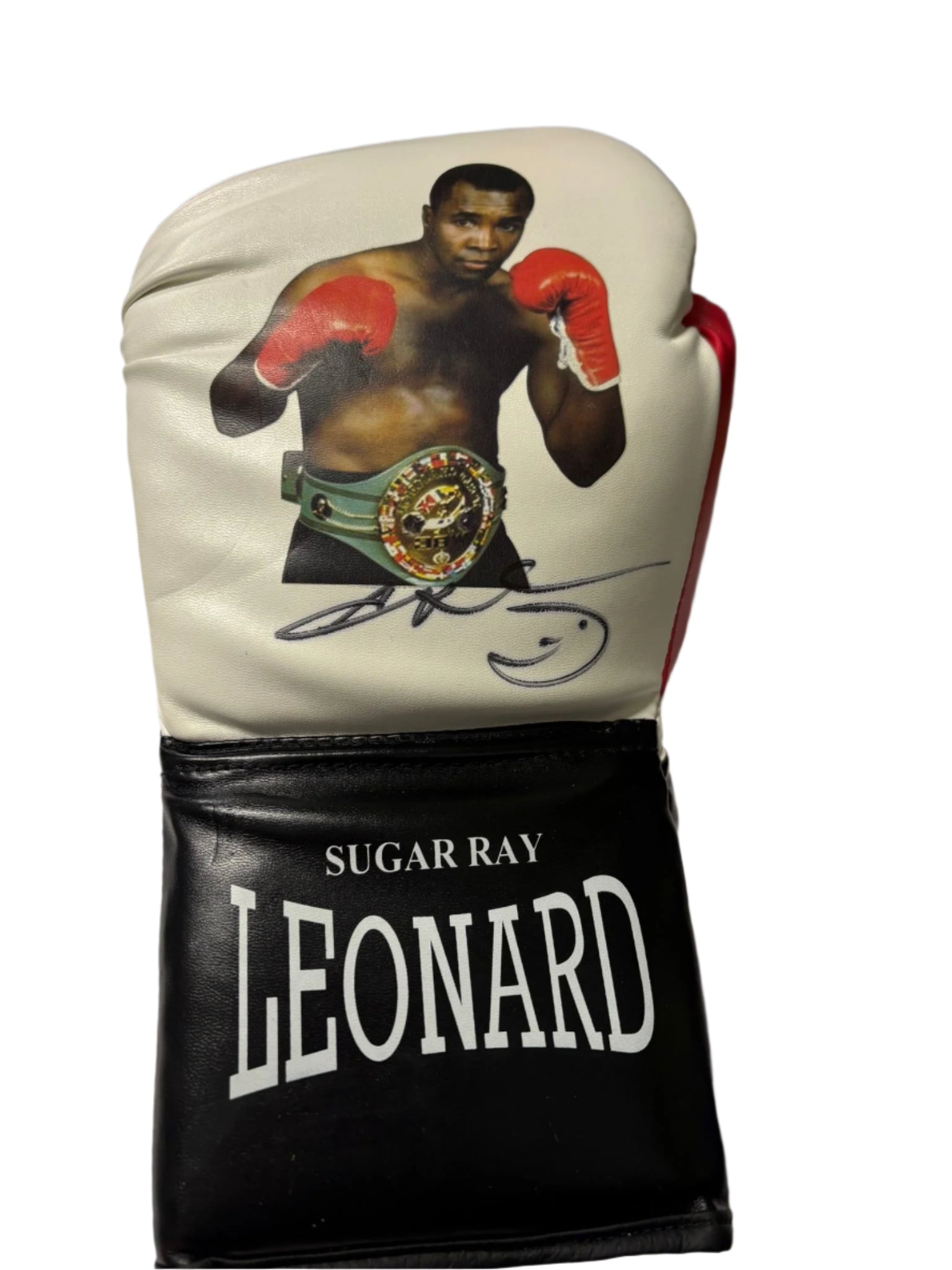 This signed white photo boxing glove featuring the legendary fighter Sugar Ray Leonard is the ultimate collector's item for boxing enthusiasts. With an expertly authenticated certificate of authenticity, this piece is a surefire way to elevate your boxing memorabilia collection.