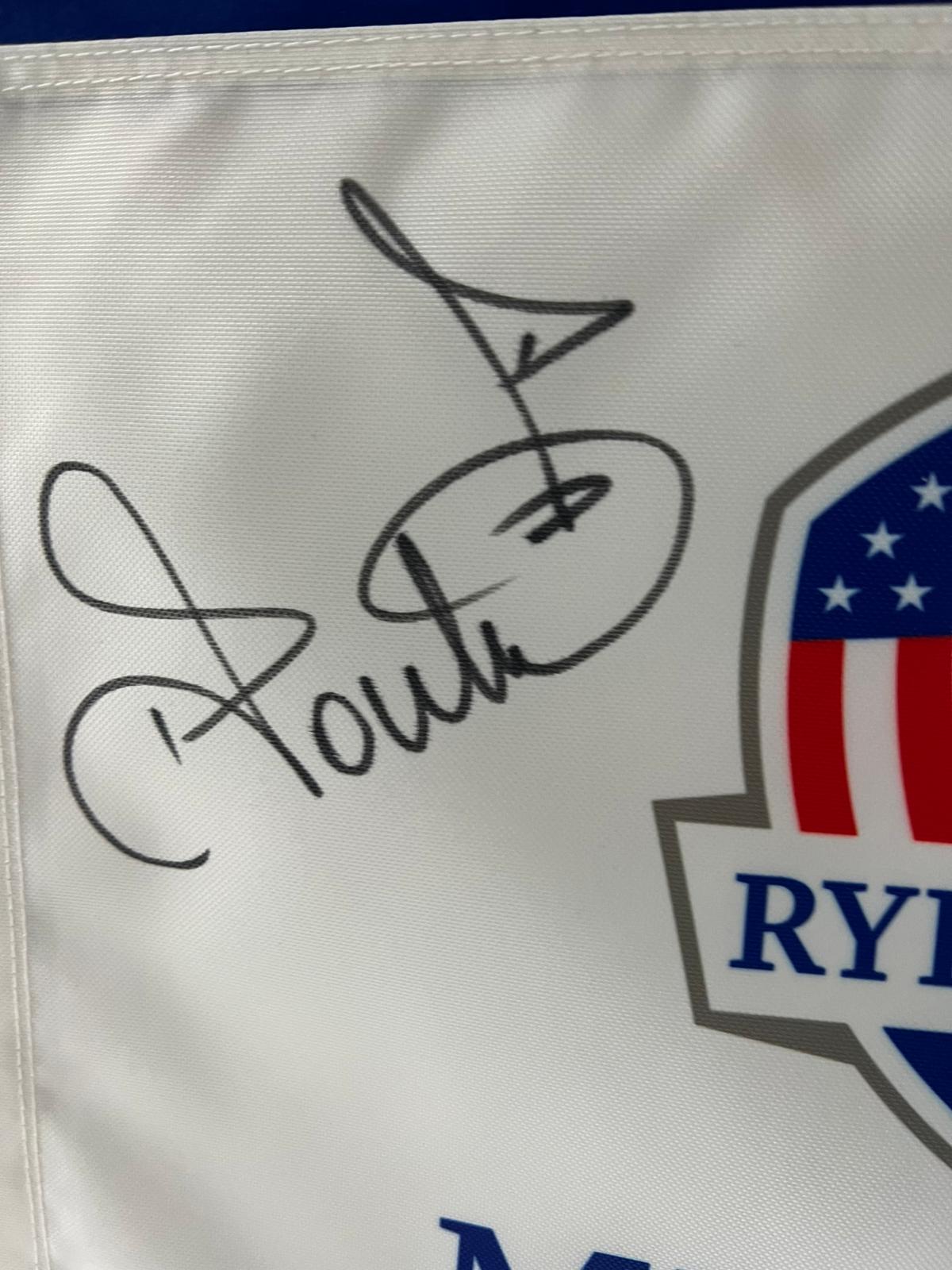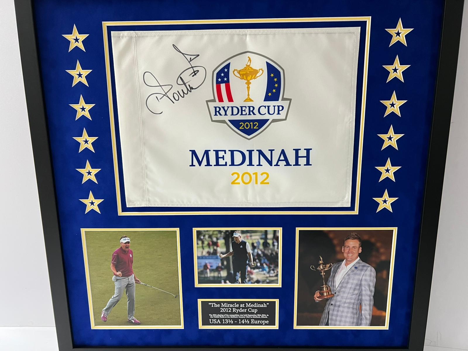 Celebrate the epic comeback of the 2012 Ryder Cup with this 'Miracle at Medinah' flag display signed by Ian Poulter. Team Europe's 8 single game wins on the last day secured their outright victory, with Poulter's 5 consecutive birdies adding to this historic moment. Own a piece of golf history with this certified collectible.