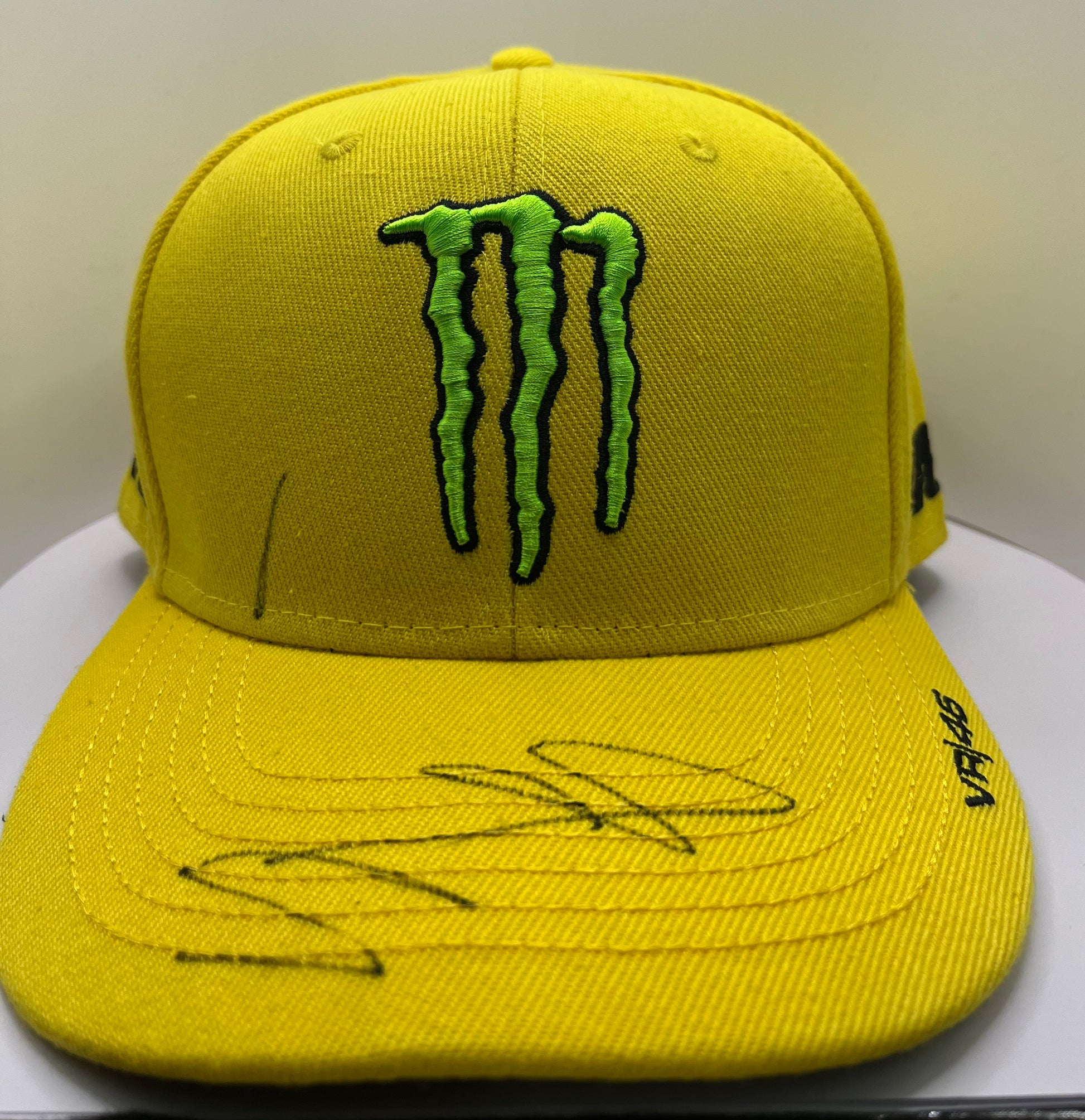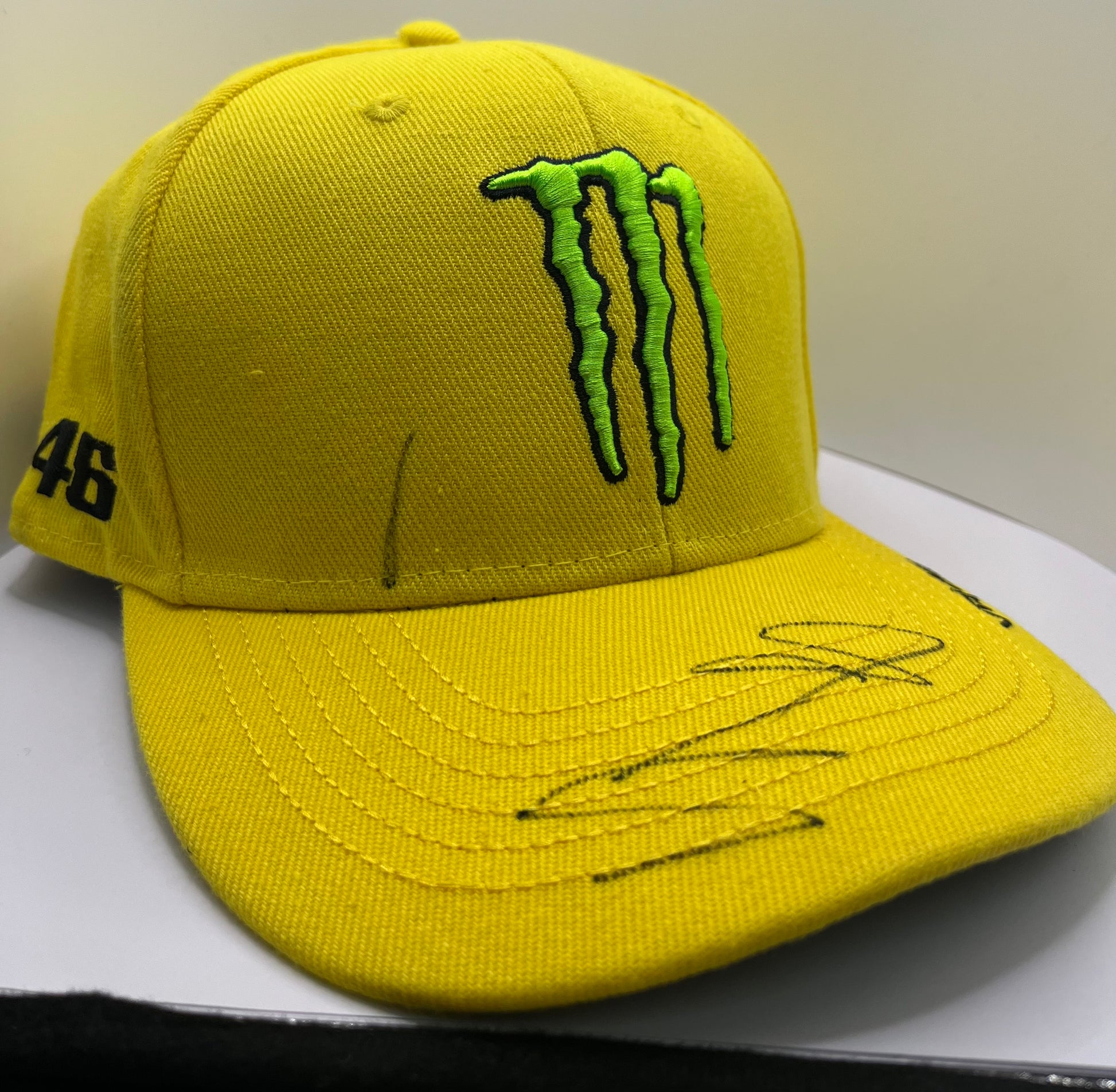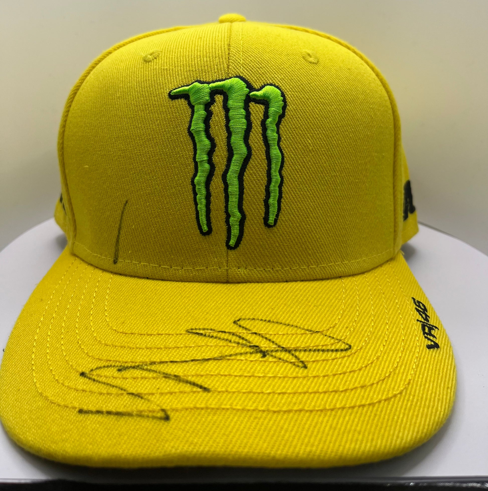 This signed Valentino Rossi cap is a must-have for fans of the MotoGP legend. The yellow Monster Energy design makes it stand out, while the Certificate of Authenticity ensures its true value. Show your support and own a piece of history with this exclusive collector's item.