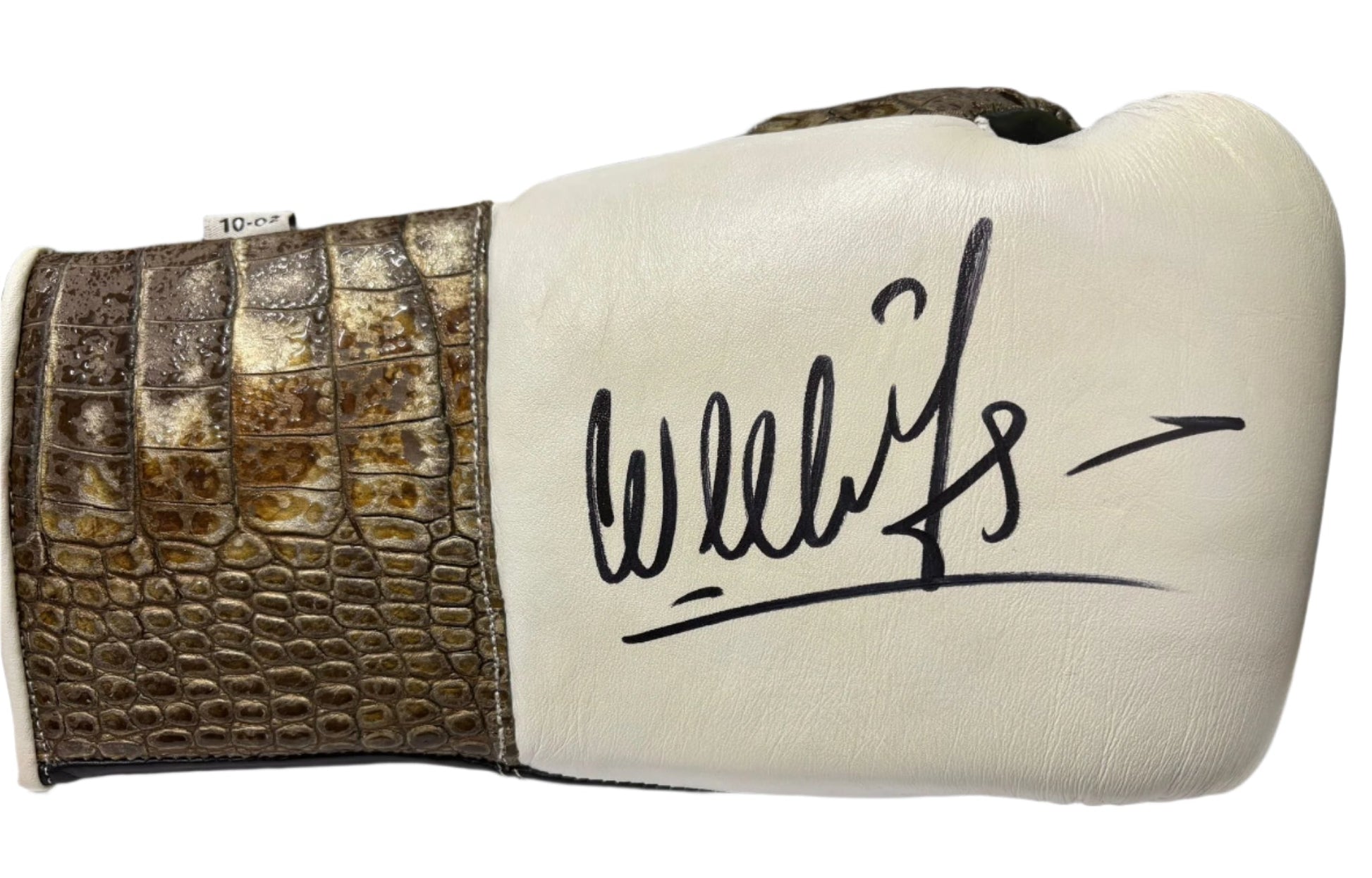 This Wladimir Klitschko signed boxing glove is a true collector's item. Crafted in white with a bold signature and certificate of authenticity, it's a must-have for any fan of the Ukrainian heavyweight boxer. Show off your love for the sport and add this to your collection today.